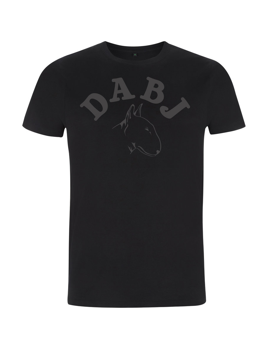 Organic cotton tee in black with OG DABJ 'Reggie logo' in dark grey